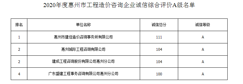 附件:2020年度惠州市工程造價(jià)咨詢企業(yè)誠信綜合評(píng)價(jià)A級(jí)名單